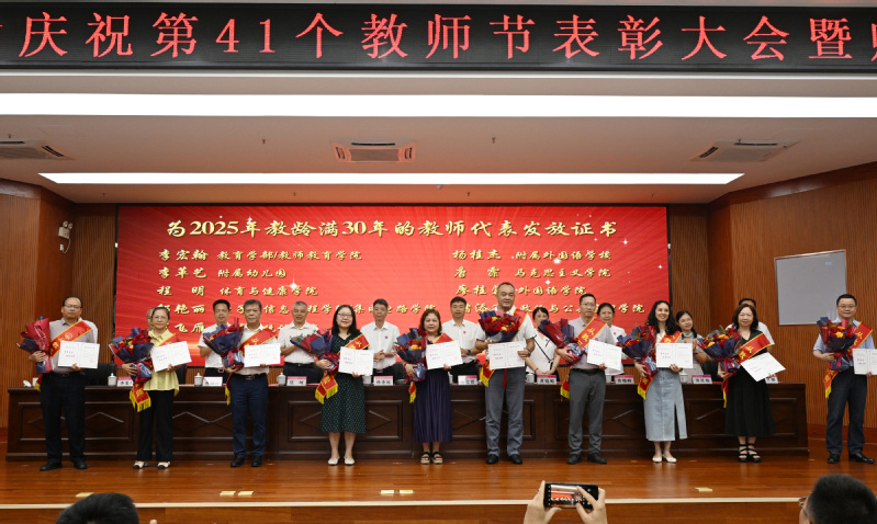 9月9日,在第41个教师节来临之际,我校在育才校区举行2025年教师节表彰大会暨师德论坛。大会以“以教育家精神铸魂强师,谱写教育强国建设华章”为主题,旨在深入学习贯彻习近平总书记关于教育的重要论述,大力弘扬教育家精神,表彰先进典型,交流育人经验,共同展望学校教育事业发展蓝图。校党委副书记、校长孙杰远出席会议并讲话,全体在家校领导、校党委常委参加表彰大会。大会由校党委副书记黄文韬主持。