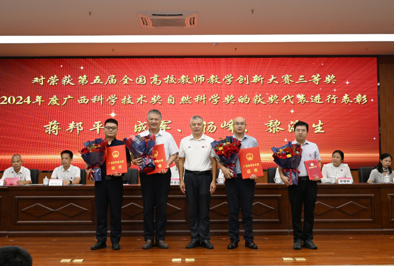 校党委副书记、自治区纪委监委驻学校纪检监察组组长莫坷为荣获第五届全国高校教师教学创新大赛三等奖、2024年度广西科学技术奖自然科学奖获奖代表颁奖