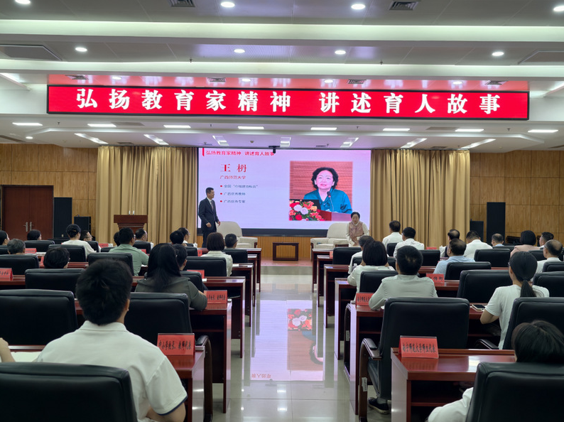 为庆祝第41个教师节,9月5日上午,由自治区教育厅主办的“弘扬教育家精神,讲述育人故事”活动在南宁举行。自治区教育厅党组成员、副厅长潘旭阳出席活动并致辞。广西师范大学党委副书记、校长孙杰远在活动中深刻鲜活的回答了“教育强国,师者何为”的重大时代命题,勉励范徽丽等众多教师在基础教育的沃土上书写属于这个时代的教育华章。我校教育学部/教师教育学院王枬教授受邀登台讲述育人故事。学校在雁山校区第五会议室设立分会场,校党委常委、副校长黄晓昀,各学院(部)、各单位负责人,专任教师代表以及学生代表参加活动。
